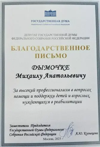 Заместитель председателя Государственной думы Федерального собрания Российской Федерации Анна Юрьевна Кузнецова вручила Благодарственное письмо Михаилу Анатольевичу Дымочке, и.о. руководителя – главного федерального эксперта по медико-социальной экспертизе ФГБУ ФБ МСЭ Минтруда России за высокий профессионализм в вопросах помощи и поддержки детей и взрослых, нуждающихся в реабилитации.